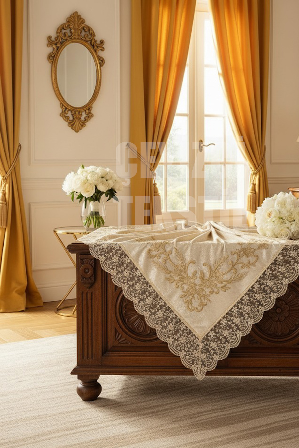 Çeyizlik Bohça, Saten Bohça Dantelli Nişan Bohçası - Krem Kadife