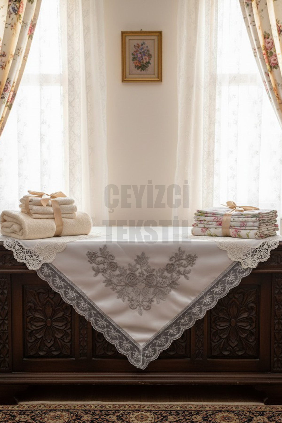 Fransız Güpürlü Işlemeli, Çeyizlik Saten Lüks Bohça, Nişan Bohçası