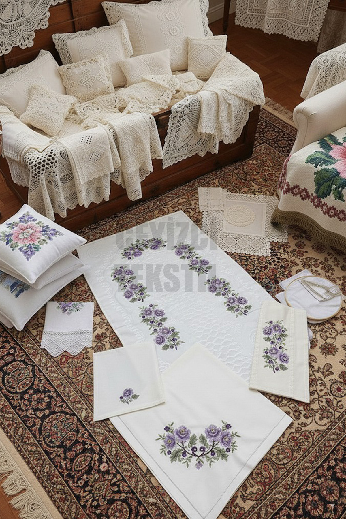 Kanaviçe Seccade Takımı, Seccade Seti Kanaviçe Renkli 4 Parça Seccade Kanaviçe Takım – Mor
